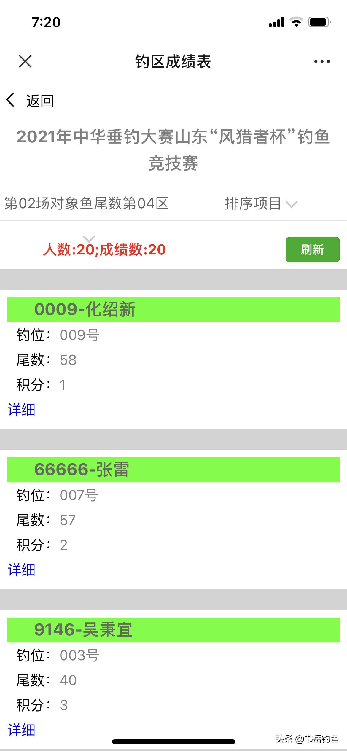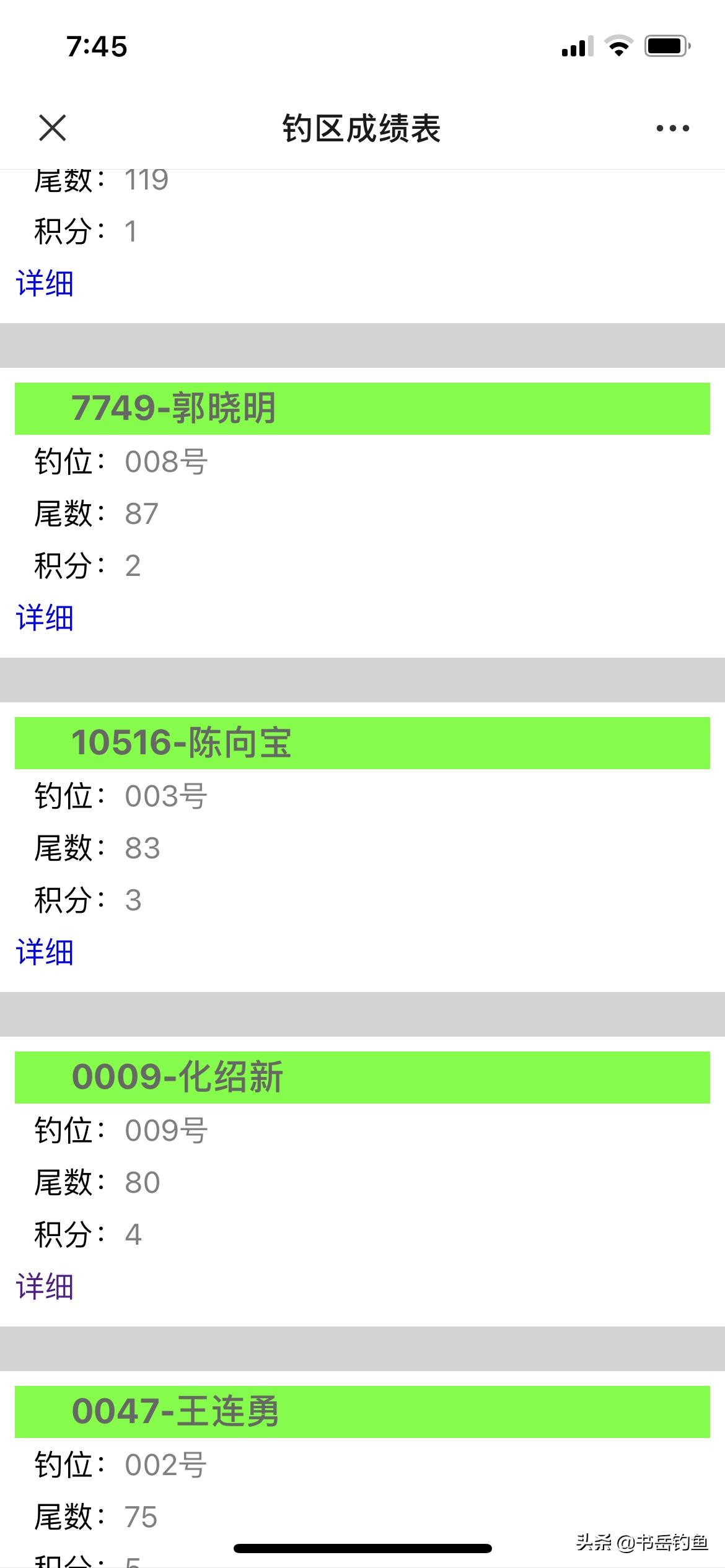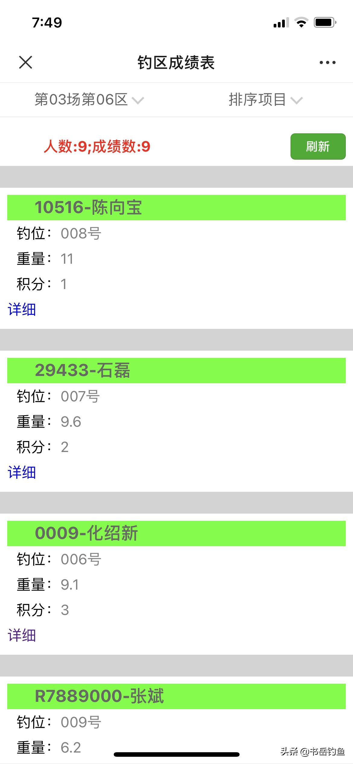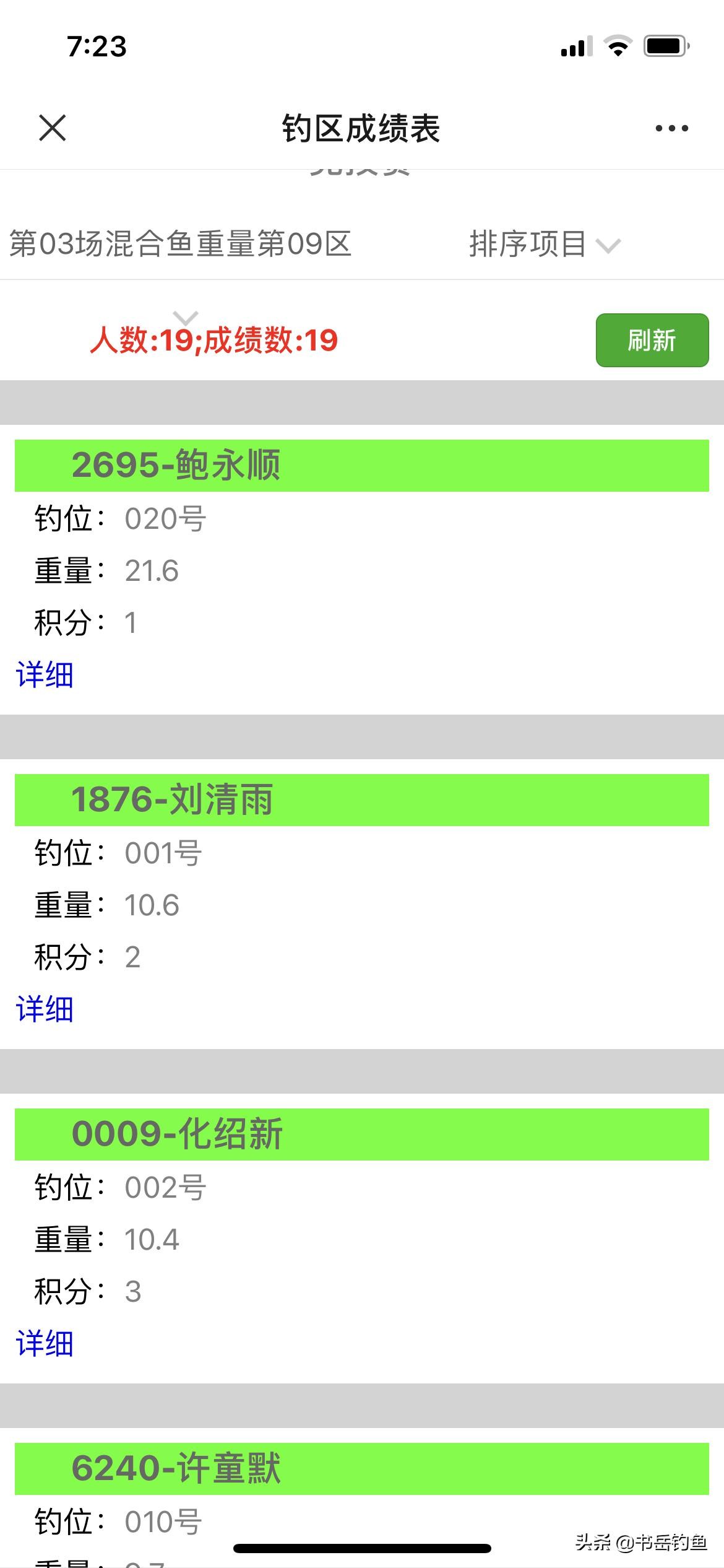 通过总体成绩不难看出,化老师只有在第一场尾数鱼中,获得了较大的分数,才导致了不利的垂钓结局。这样的比赛成绩是否和钓位相关呢?还是要看一下钓位成绩的横向对比才可以。