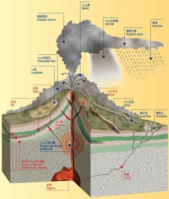 现代地质学对火山给出了更完善的定义,是指地球深部的岩浆、气体和液体等挥发物质在周围岩石压力作用下沿地壳中的薄弱部位快速喷出地表所形成的不同形态的山丘。是包括了岩浆的运移喷发及其产物的完整的地质过程。一个完整的火山主要由岩浆房、火山通道、火山锥、火山口这四部分组成。