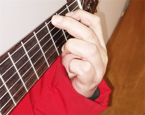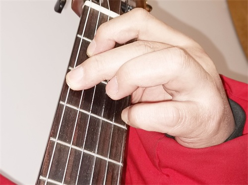 上图2左中食指按住五弦二品,中指按住六弦三品,小指按住一弦三品。
