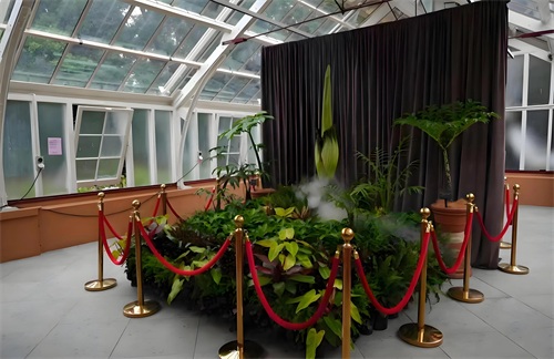 此次绽放的尸体花被安置在一个具有哥特式风格的紫色帷幔前,吸引了众多植物爱好者前来观赏。展览的设计灵感来源于1901年维多利亚女王的葬礼、《洛基恐怖秀》和已故导演大卫·林奇的作品。展览现场还播放古典音乐,让参观者仿佛置身于一场壮丽宏伟的仪式中。