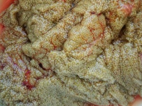 3、鱼籽用水冲洗,把表面的血丝黑膜去掉