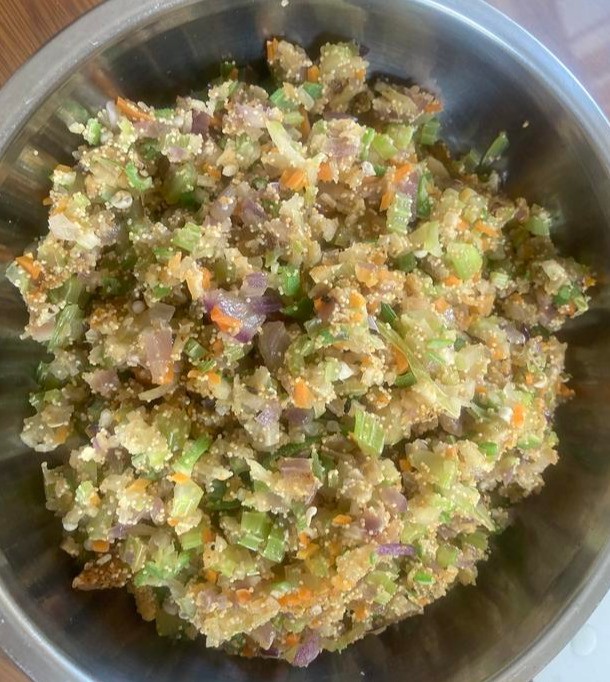 鱼籽,胡萝卜,洋葱,芹菜,秋葵,盐,生姜,香葱,花生油,料酒