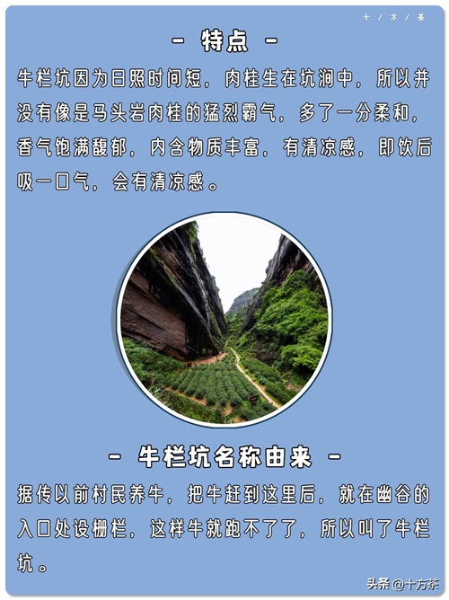 牛栏坑因为日照时间短,肉桂生在坑涧中,所以并没有像是马头岩肉桂的猛烈霸气,多了一分柔和香气饱满馥郁,内含物质丰富,有清凉感,即饮后吸一口气,会有清凉感。