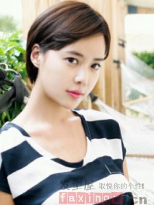 小脸女生很适合的一款偏分短发发型,深咖色系的发色,低调又不失时尚范,白皙的小脸,搭配条纹的上衣,简单突显时尚范。