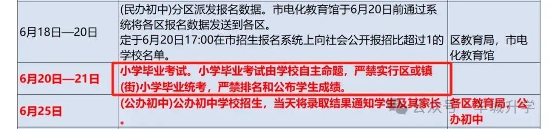 从此前曝光的2024年小升初招生日程安排来看,今年的小六毕业考应该会集中在6月20-21日举行,各小学自行命题。