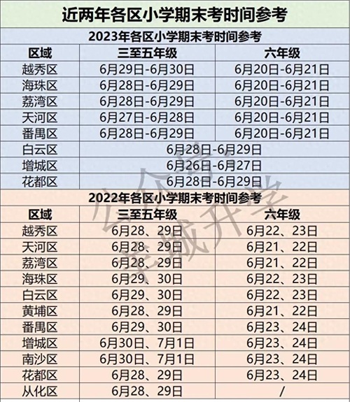 2023年广州初中期末时间基本都安排在6月26日-6月30日那周。但是正常来说,初中跟小学举行期末考时间是比较相近的。往年期末就是在端午节后1-2周左右举行。但是今年初中期末考时间受今年中考时间(6月30日-7月2日广州中考)延后影响,部分初中校区需要作为中考考场,所以今年初一初二的期末不排除也会延后至7月8日-7月12日左右举行。
