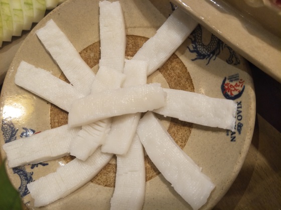鸭血。他家的鸭血真的是非常嫩,不知道是真正的鸭血还是掺加了别的,拿上来之后用勺子都舀不成个,一碰就要掉似的,放在盘子中还来回的滑动,煮的时候就这样整块的倒入锅中去煮。