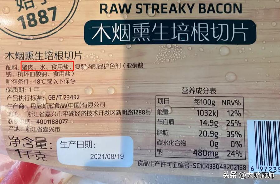 ②配料表——目前的培根,都是包装的冷冻肉制品,看看配料表就知道了。真培根只有猪肉、水、食盐、护色剂等成分,而假培根的话还加入了其它肉,以及大豆蛋白、卡拉胶等成分,一看就明白了。