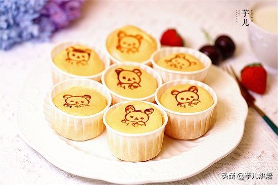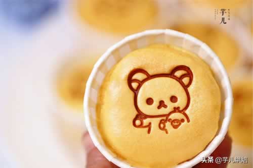 12.时间到了,蛋糕出炉了。再用蛋糕烙印印出图案,纸杯蛋糕就做好了。