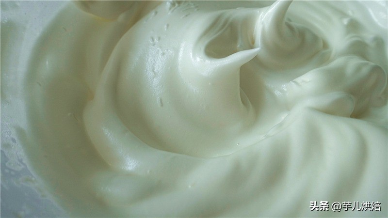 6.用电动打蛋器将蛋白搅打至鱼眼泡状态,分三次加入细砂糖搅打至硬性发泡状态。