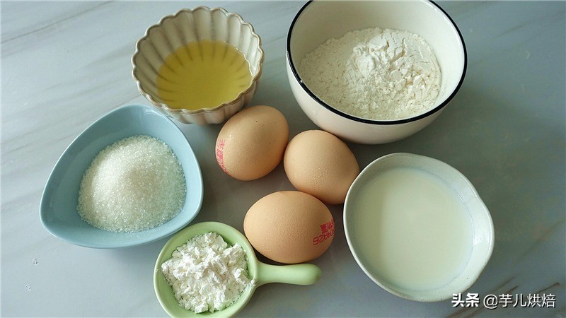 食材:低筋面粉 68克,玉米油 37克,牛奶 55克,鸡蛋 3个,细砂糖 40克,玉米淀粉 10克,白醋 数滴。