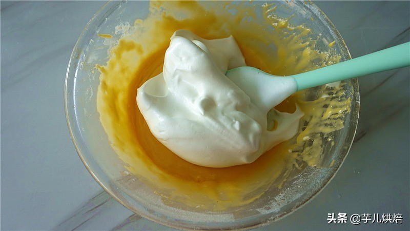 7.取三分之一的蛋白霜倒入面糊里,翻拌均匀。