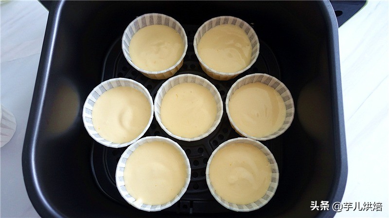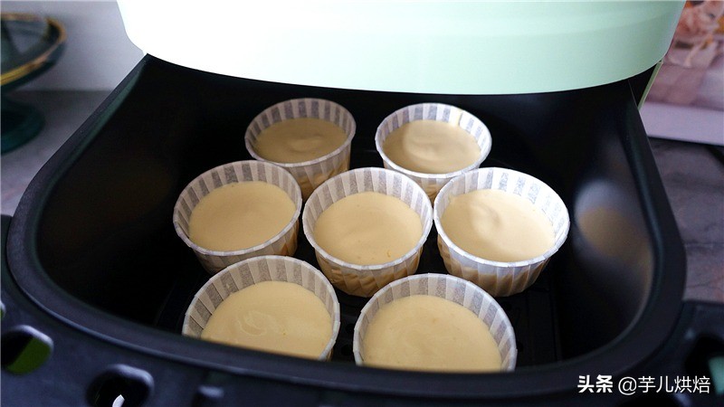9.将拌好的面糊装入裱花袋,挤入纸杯8分满,轻震几次去除气泡,再将纸杯放入空气炸锅的炸篮里。