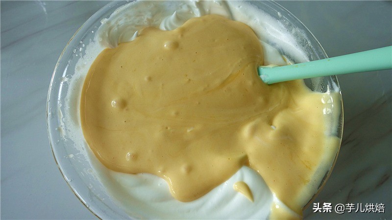 8,再将拌好的面糊倒入剩余的蛋白霜里翻拌均匀。