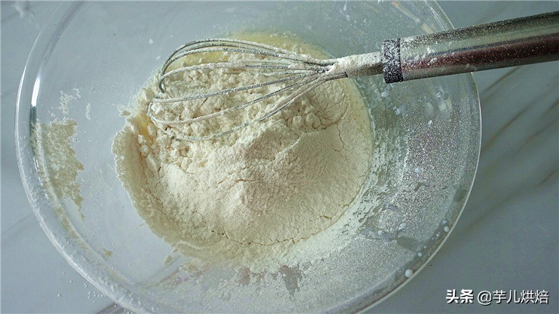 3.将低筋面粉过筛到碗里。画”Z”字拌匀。