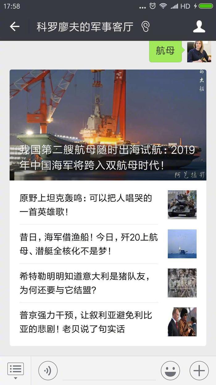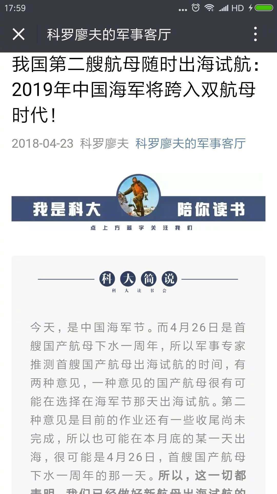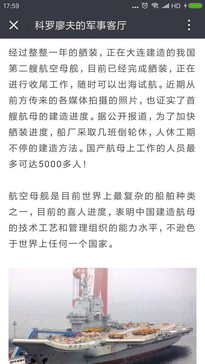 目前,中国第二艘航空母舰,首艘国产航母皮皮虾号,建造工作已接近尾声,马上就开始海上试航。海试是是舰船建造的最后阶段,要让舰艇以自身动力离开码头,进行出海试验,测试舰船的真实航速、转弯半径、抗风浪性,以及在战斗状态或满负荷状态下各环节的运转情况。海试期间,航母需要多次出海测试适航性能,还要测试舰载武器装备的运行状况,只有通过海试,才能全面检验一艘新舰艇是否达到了设计标准和要求,如果海试各项指标都合格,就可以交付部队了。一般来说,由于有着辽宁舰的前例,首艘国产航母的海试时间会大大缩短,再经过10个月左右的海试时间,新航母可能会在2019年初交付人民海军,正式服役。 关注后回复 “航母”,查看这篇文章~ 可加我WX工众号:keluoliaofucn很好记:科罗廖夫处男或者中文搜索WX工众号:科罗廖夫的军事客厅
