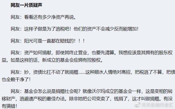 值得一提的是,在2005年时杨澜将“阳光媒体投资”权益之51%无偿捐赠给社会,建立“阳光文化基金会”。当时就有网友质疑,把一堆债的阳光捐赠,“把税逃了不算,把债也全赖干净了!”