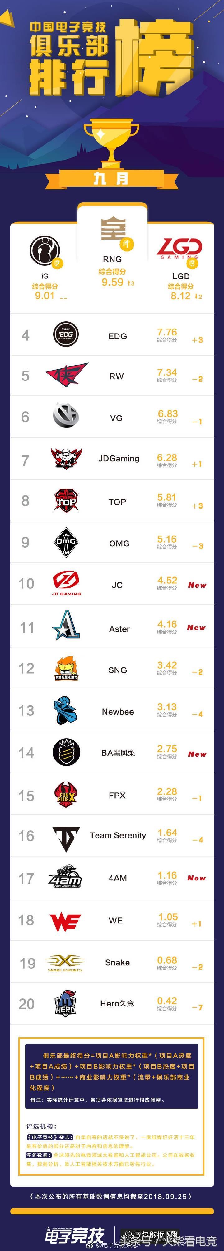 这个排名是基于国内国际各项赛事每个俱乐部战队取得的名次以及商业价值来排名的。具体公式在上面排行截图的最下面,大家可以自己去看看。