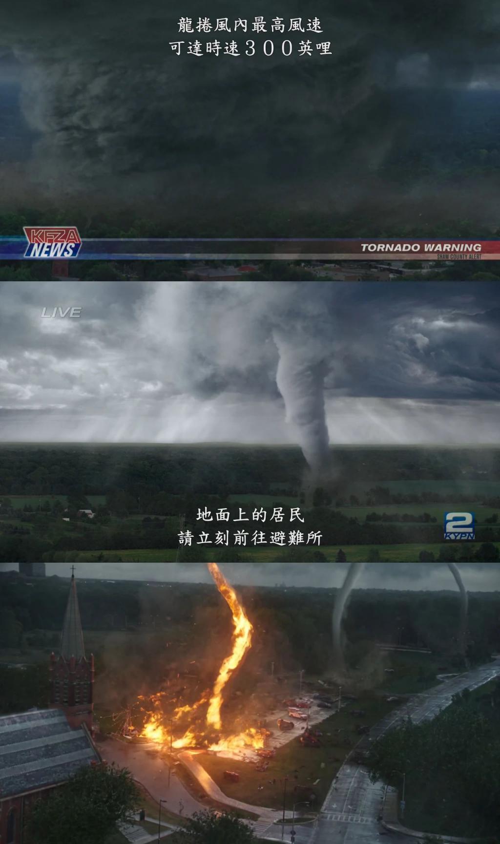 不同体量、不同形态的龙卷风所构成的层次感调动着观众的心理,和片中人物一样愈发紧张愈发恐惧。