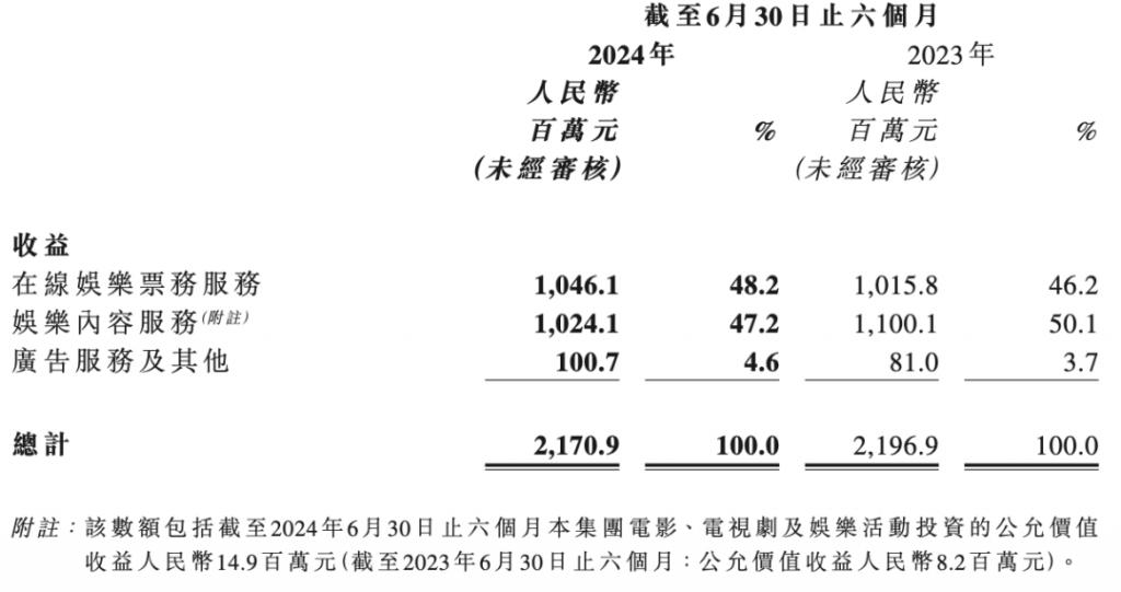 类似的情况也出现在猫眼的半年报中。猫眼在票房前五的影片中占据三个席位。而其上半年营收约 21.71 亿,同比下降 1.2%。降幅虽小,但根据其细分板块显示,这部分收入减少均源于娱乐内容服务部分收入缩减。该板块收入由 11 亿减少为 10.24 亿,同比下降 6.9%。而财报中也提到,整体收益的下降,很大程度上归结于其参与影片票房总量的下降。