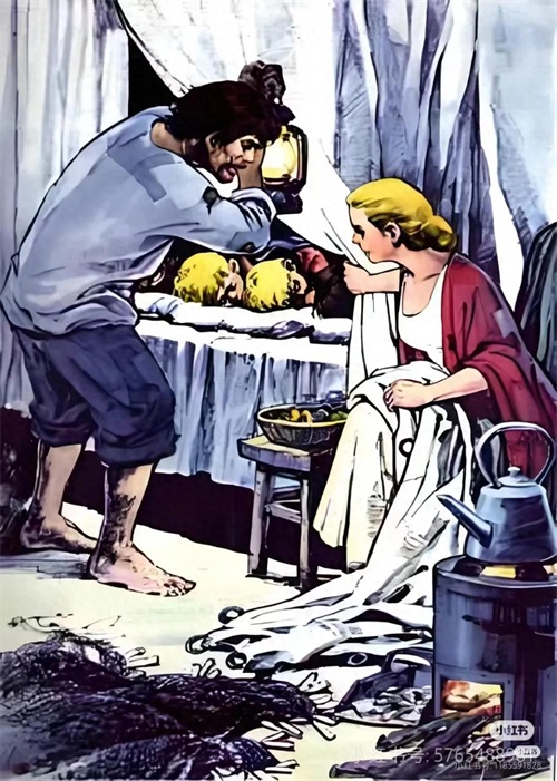 一开始我以为他言过其实,看完之后才觉得真的是。旧版插图把贫穷和脏乱还原的表达出来,更有一种患难见真情的感觉。构图里不但有人物还有部分环境描绘,一眼就能看出男人外出打渔,女人则在缝缝补补,而且渔网就在脚边也很好的表现出了屋子的狭小,故事感一下子就上来了,让人很有沉浸感和代入感。而新版插图就很像 AI 绘画,很虚假,需要文字告诉你他们是渔民,他们很穷。