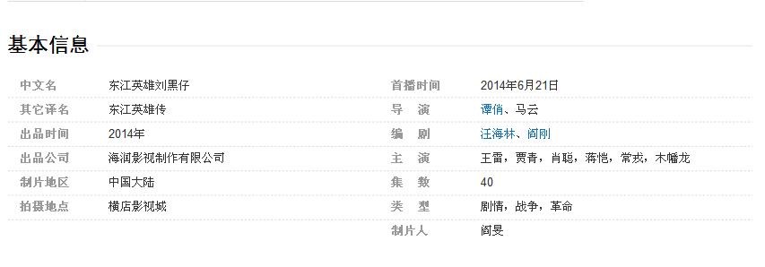 《东江英雄刘黑仔》是由海润影视制作有限公司出品,并由谭俏、马云共同指导,王雷、贾青共同主演的抗战传奇剧 。