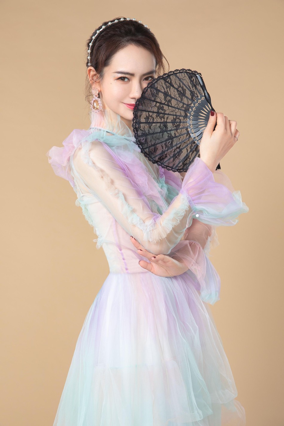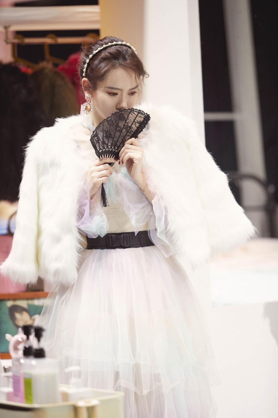 近日,《明星大侦探》曝光一组剧照,戚薇身穿彩虹仙女薄纱裙仙气飘飘,搭配珍珠发箍白色毛绒披肩和黑色蕾丝扇子,举手投足间贵气十足。
