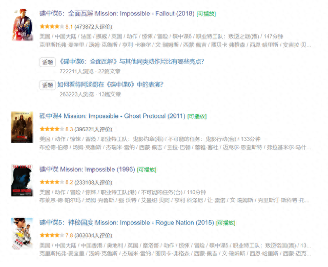 影片共六部,第七部计划在23年上映。作为一部非常成功的谍战题材系列电影,整部片子走的是成熟精英团队路线。明明你已经知道情节,但就是看得很爽。系列电影展现了以汤姆克鲁斯为灵魂人物的一众特工的超凡能力,更为我们展现了特工独特的时尚品味与魅力。