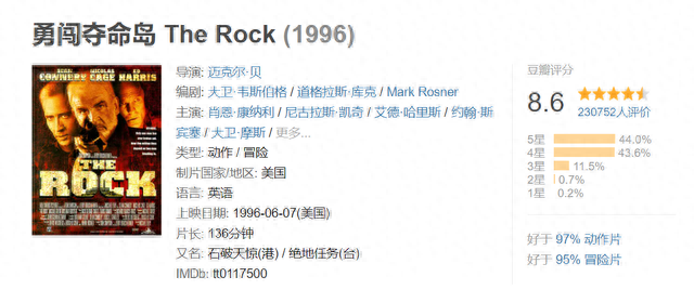 《勇闯夺命岛》,动作惊悚片,于1996年6月7日在美国上映。该片主要讲述了一群海军陆战队的军官因不满美国政府对退伍、战死军人及其家属的补偿和福利,而偷窃VX神经毒气导弹来劫持人质,以此要挟美国政府来给已死去的人以一个公正的评价的故事。