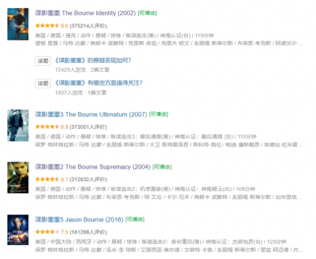 系列共有五部,谍战片里经典中的经典,马特达蒙饰演了其中的1235部。相比007,碟中谍,本片没有美女帮忙或高科技道具,全靠观察力、身手。将动作戏和感情戏融合得非常自然,拥有着极强的代入感,电影节奏也做得非常出色,没有任何的拖沓之处。观影时让我非常兴奋的是杰森伯恩每次都能比追捕他的一方想的前一步,能在危机时机拥有如此缜密的思维是让人十分佩服的。