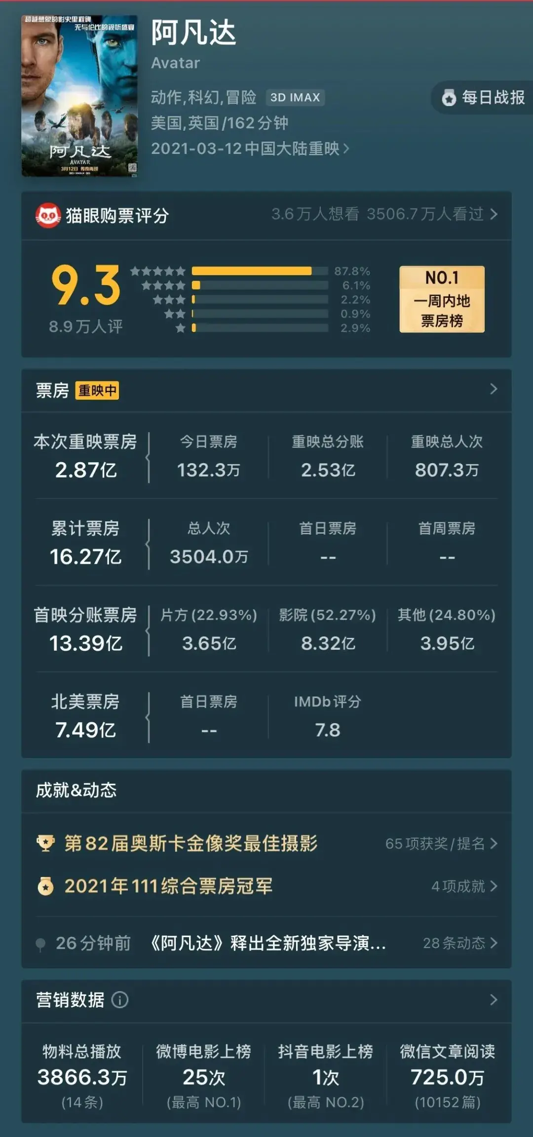 2021年,中国电影市场全面开始复苏,多部电影创造了多项国内外票房纪录。詹姆斯·卡梅隆执导的3D科幻大片《阿凡达》也在近日于中国电影市场重映,第二次取得了全球票房冠军。