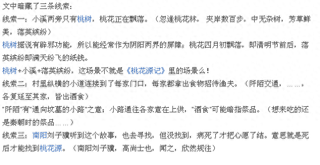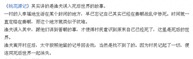 再来说说陶渊明的《桃花源记》,早在前几年,《桃花源记》被网友们脑洞解析,渔夫误入死人国,桃花源其实是墓地。