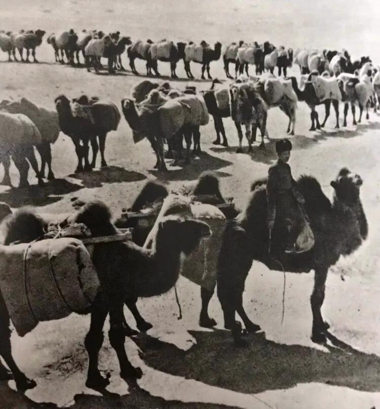 民国十三年(1924)11月26日,蒙古人民共和国成立,前营、后营、圐圙三路随即关闭。于是拉骆驼的又从新开劈了呼和浩特至新疆古城(今奇台县)的驼道,称之为绥新路。以古城、迪化(今乌鲁木齐)为终点设三条道路,即北、中、南路。北路经外蒙古沿宁夏、甘肃边境行走。这条路又分大西路、小西路。设64站,长5140里,沿途水草丰茂,所以驼队去新疆多走此道。据当年拉骆驼的石姓驼工回来说:大西路较短,但是途中沙漠多,两站又远,行走艰难。而小西路谁说路程较长,但两站间距小,无阻碍,故驼队多走小西路。该路以呼和浩特为起点,经武川、百灵庙、公忽洞滩进入大西路,从赛圪贴尔偏西北行,进入外蒙古土谢图部,一直行到哈拉牛汇合成一线,到老龙庙再进入新疆,继续行110里到达古城。
