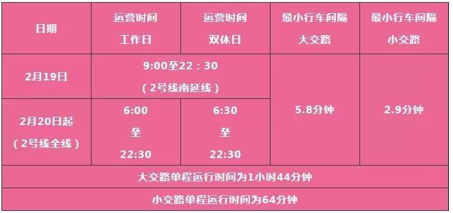 2月20日起,轨道交通2号线(含机场线、2号线南延线)运营时间工作日为6:00-22:30,双休日为6:30-22:30(国家法定节假日及其他特殊情况另行通知),全线按大交路(天河机场站-佛祖岭站)、小交路(金银潭站-光谷火车站)比1:1组织运营。
