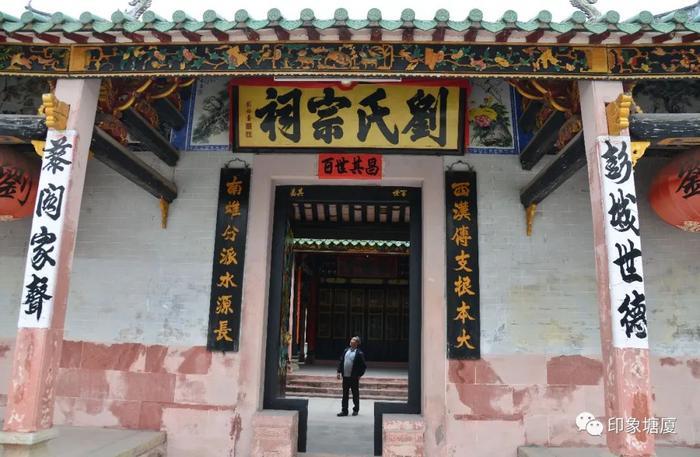 站在大门前,迎头便是满布岁月痕迹的“刘氏宗祠”牌匾,大门两边的对联也颇有意思:“西汉传支根本大,南雄分派水源长”。