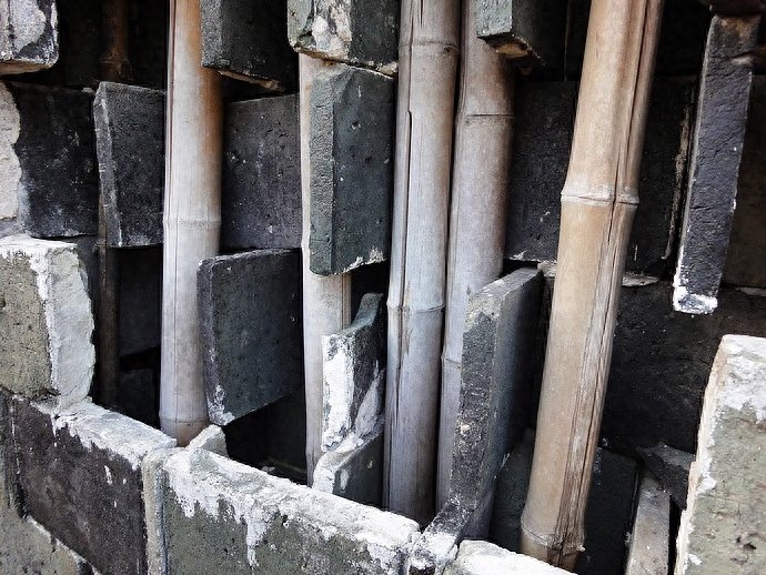 吴氏大宅还有一个特色是我在其它古宅中没有见过的。它的墙体里外由两层灰砖砌筑,中间为空心,很奇特的是中间部分夹着一根根竖立的长竹,一问才知道原来长竹是为了防盗,有如现在的防盗窗,不禁再次赞叹古人的智慧。[赞]