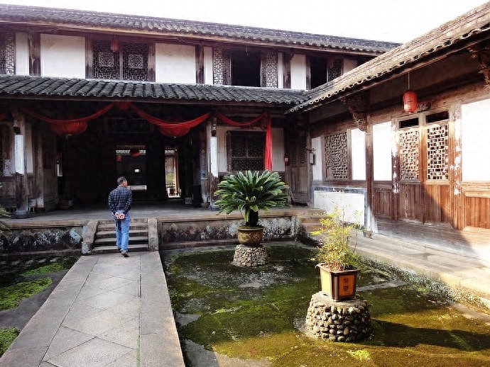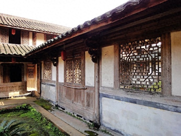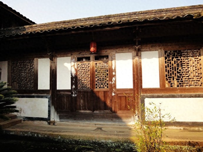 大宅依山而建,逐层抬高。大门后是一个走廊,两侧各有美人靠,尽头是又一组石台阶,这种设计在古宅中比较罕见。