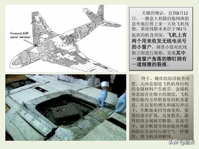 客机的舷窗本来就要让蒙皮结构承受很大的应力,彗星客机的舷窗是方形的,在角部会有很大的应力集中因此舷窗的角部就会疲劳的更快,而飞机每次起飞都需要增压,就如同给一个气球不断的吹气放气一样,加压客舱造成的内外压力差又加剧了这种疲劳。渐渐的机身就会产生裂纹,裂纹不断的蔓延最终就会造成飞机解体。