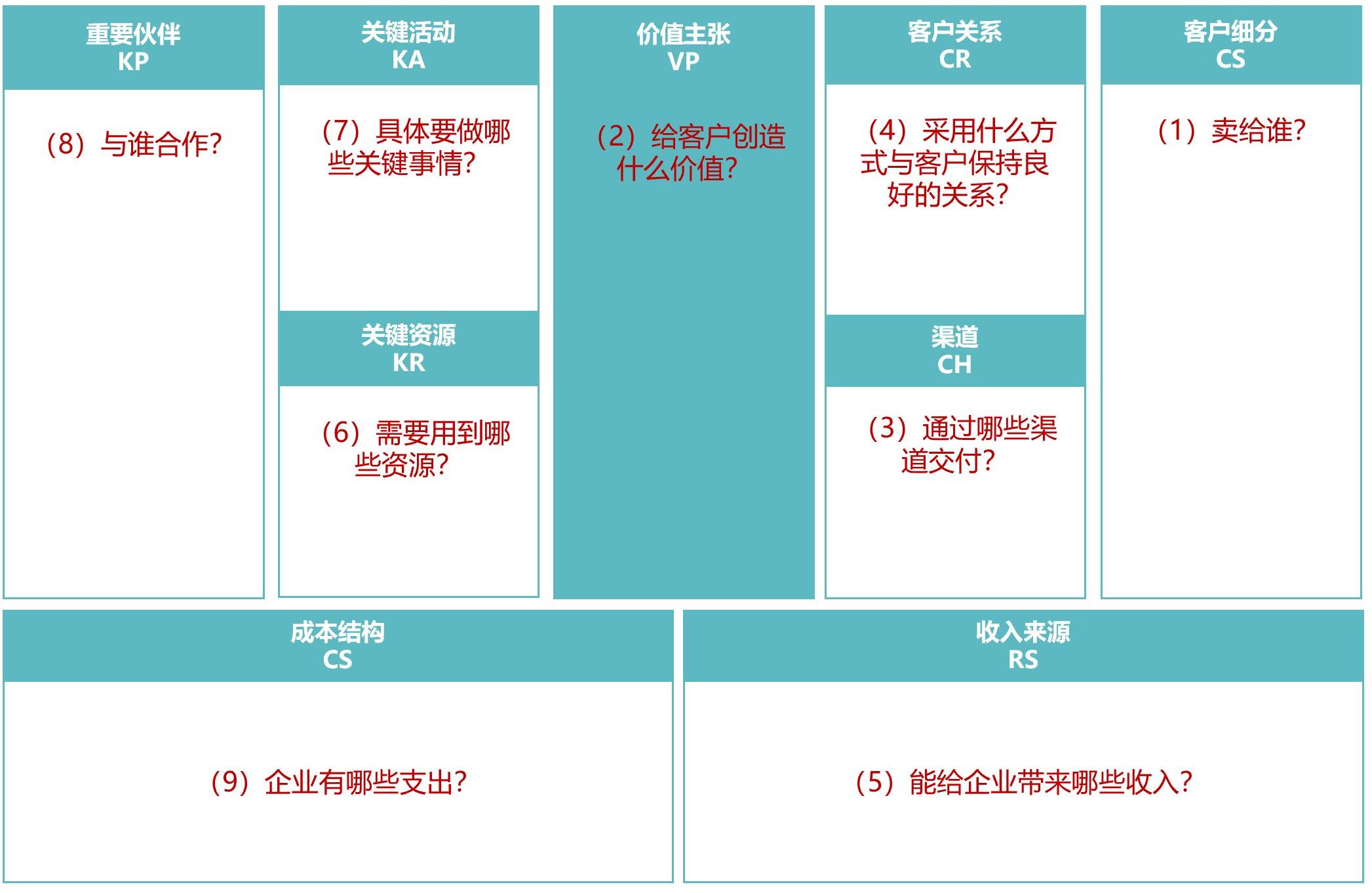 如何描述商业模式?采用商业模式画布工具(Business Model Canvas ) 从九个方面全方位描绘商业模式(客户细分、价值主张、渠道、客户关系、收入来源、关键资源、关键活动、重要伙伴、成本结构),主要回答三个问题:为客户创造什么价值?用哪些资源才可以将产品或服务做出来?这样做了,是否可以盈利?