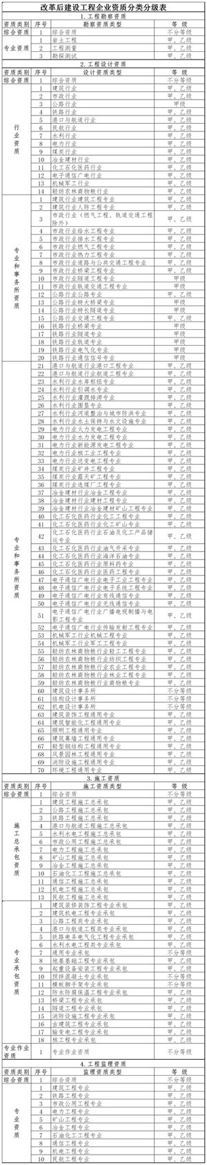 新资质改革措施实施后,将按新的建设工程企业资质分类分级表实施。见下图