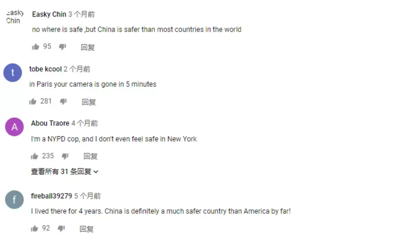 对此,小玩子一方面感激有外国友人不带偏见地向外网展示中国真正面貌(毕竟外网对我们的误解挺大),另一方面也对该条视频的评论区里其他外国人对此问题的看法很感兴趣,故特将此事关“中国是否安全”的外网评论,分享给在座的你们。(图片为翻译原本,嫌麻烦的亲可以直接查看下方的文字翻译哟)