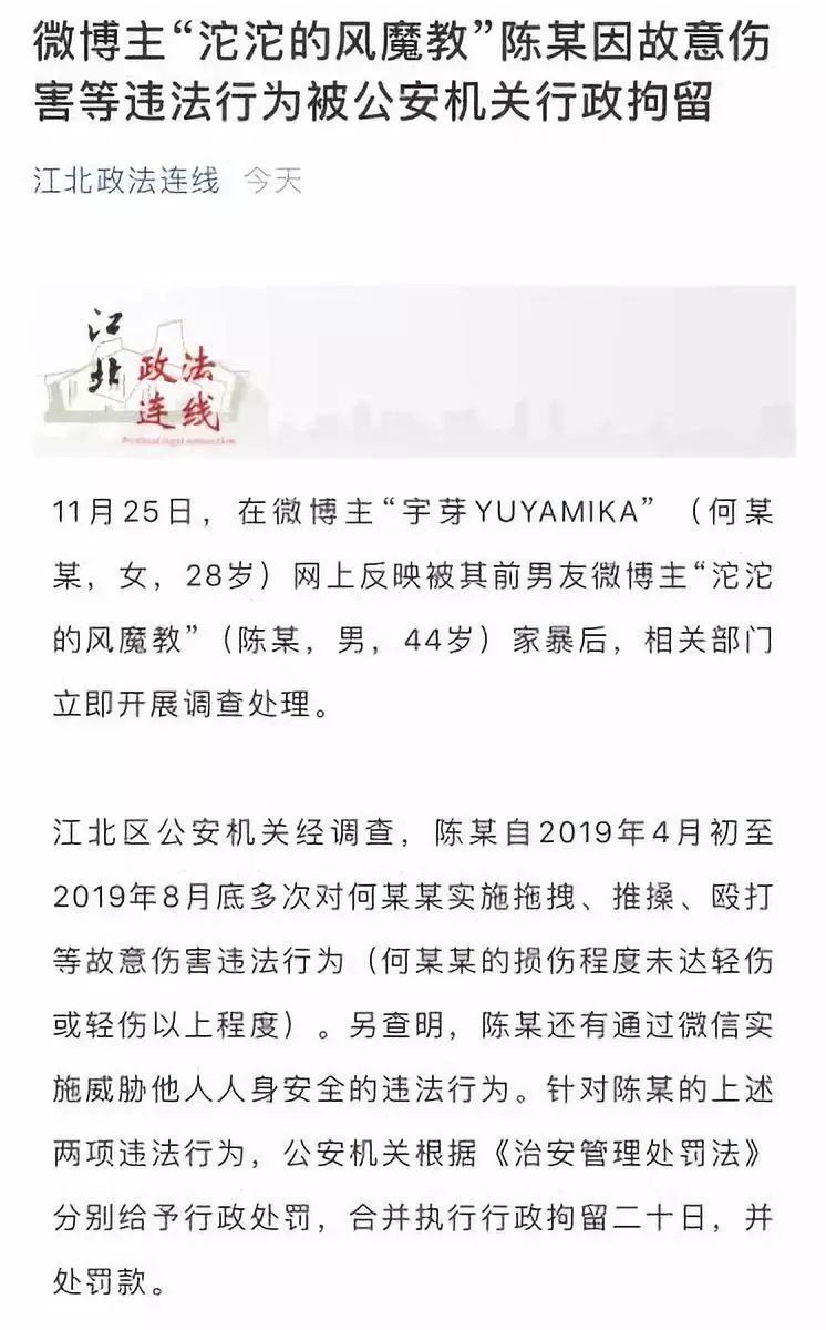 11月25日,在微博主“宇芽YUYAMIKA” (何某某,女,28岁)网上反映被其前男友微博主“沱沱的风魔教”(陈某,男,44岁)家暴后,相关部门立即开展调查处理。