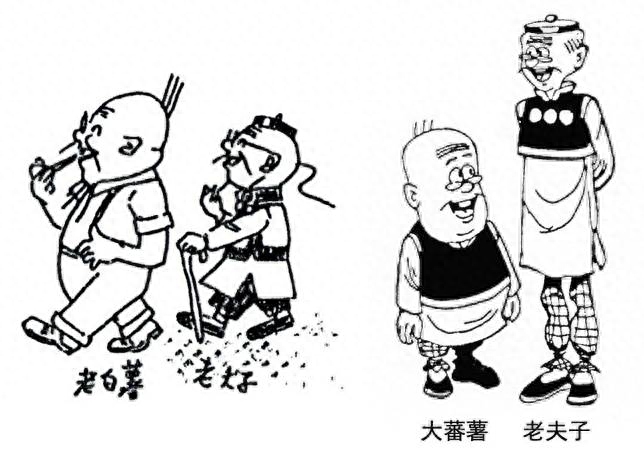 (左为朋弟先生笔下的老夫子和老白薯,右为王家禧先生创作的老夫子和大番薯)