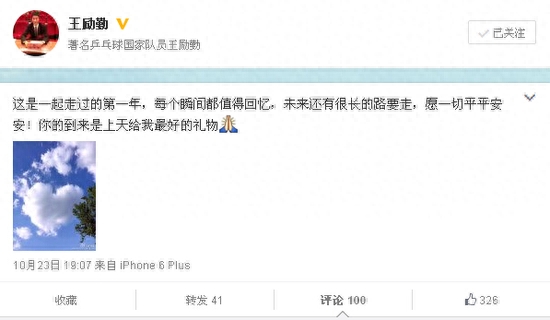 相恋一年多,王励勤从不晒两人照片,对于外界的流言蜚语也从不正面回应。甚至连他周围的同事,也是通过微博才知道他结婚的讯息。但,爱终归是要大声说出来的。这次,王励勤就是这样感恩妻子享受爱情的。