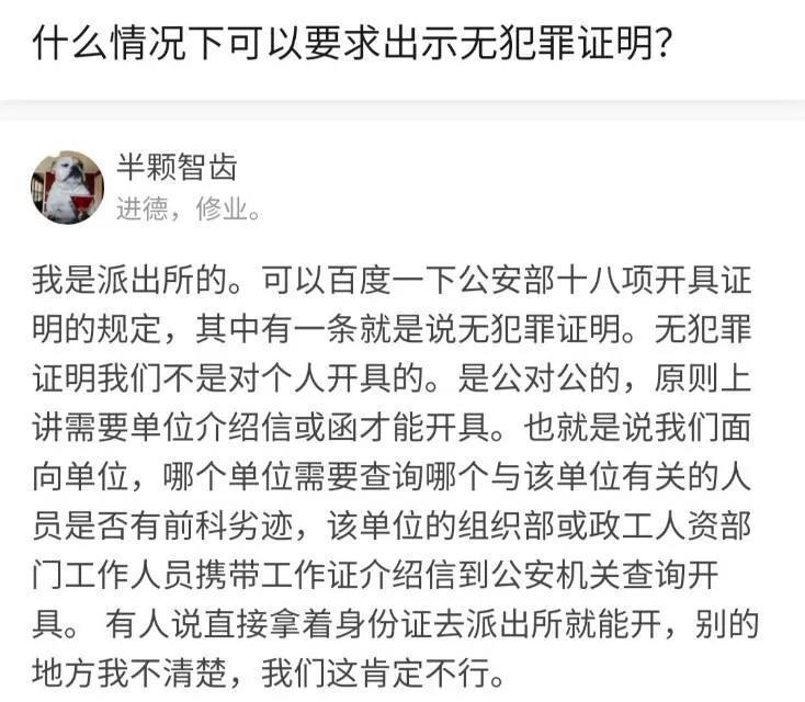 根据地方民警表示,无犯罪证明记录一般是公对公,也就是说不是对个人开具,而是对申请人所在单位委托才可以开具。