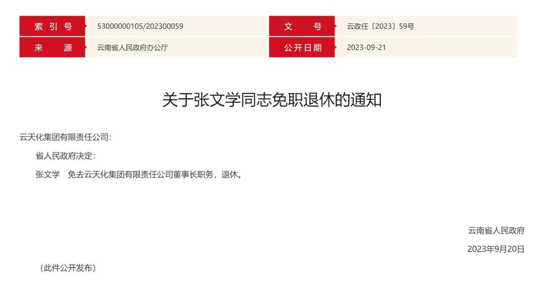 有意思的是,2023年9月20日,云南省政府曾发布通知,免去张文学云天化集团董事长职务,原因是退休了。