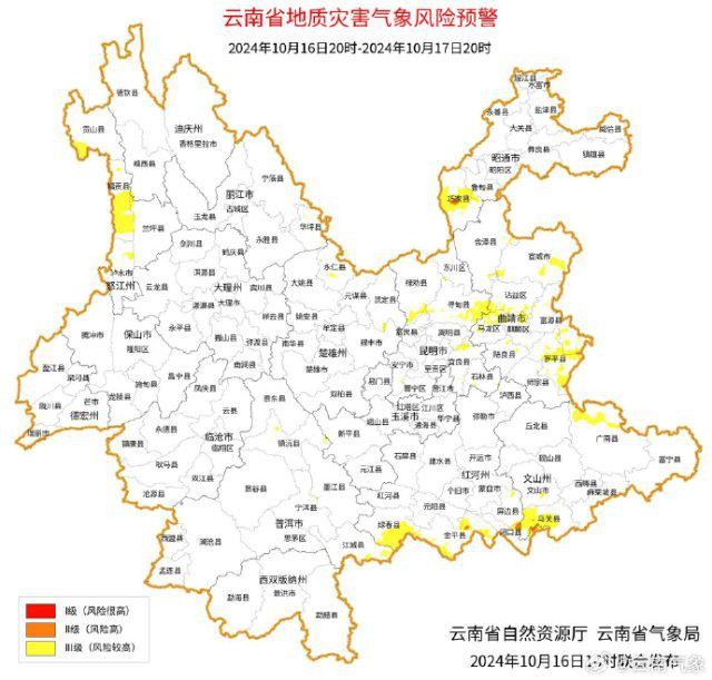 10月16日20:00~10月17日20:00,红河州金平县、屏边县、河口县,文山州马关县发生滑坡泥石流的风险高;昆明市东部、西部,楚雄州北部,怒江州北部、中部,普洱市北部、东南部,红河州南部,文山州北部、西南部,曲靖市北部、中部和东南部,昭通市西南部发生滑坡泥石流的风险较高。
