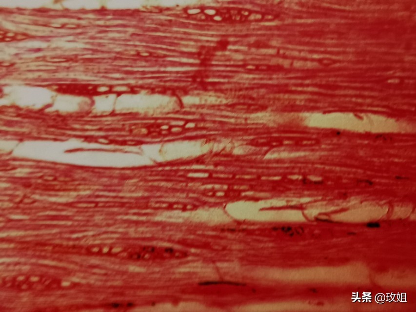 单管孔少数2~4个径列复管孔,散生,导管分子单穿孔,管间纹孔式互列,轴向薄壁组织星散状,环管状,短弦线状。木纤维薄壁厚,木射线非叠生,单列射线高2~6个,多列射线宽2~3个细胞,含5~12个细胞,射线组织同形异形Ⅱ型和Ⅲ型。
