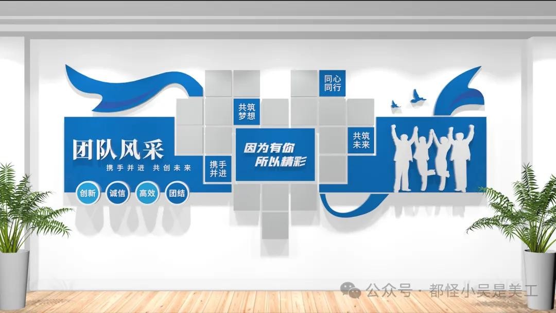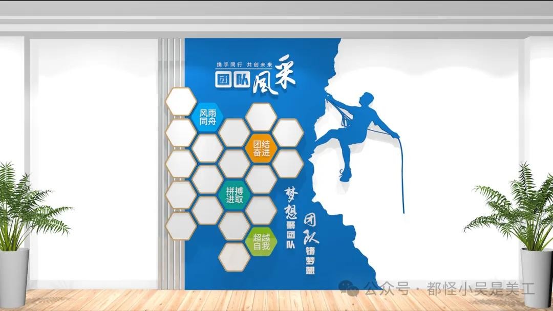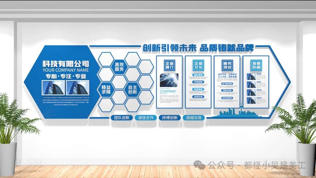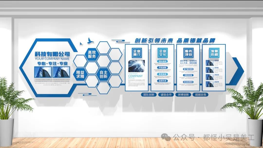 员工团队风采照片墙、公司简介、企业文化墙、服务项目、发展历程等结合,设计简洁明了,以便员工和客户能够快速理解企业文化和价值观。