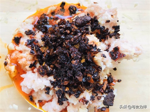 第四步,做馅料,猪肉泥里加入料酒5克,蒜末和姜末先搅匀。油锅里加入2小勺调味油烧热,放入郫县豆瓣酱25克用小火炒香,炒出红油,炒好后稍稍放凉倒入猪肉泥里,再加入孜然粉2克,花椒粉3克,辣椒粉5克,蚝油30克,肉松10克和芝麻2克搅拌均匀。